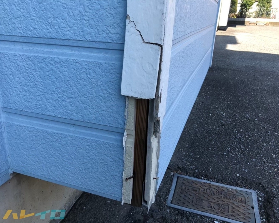 本事例は、車の衝突によって建物の外壁に直接的な衝撃が加わり、外壁材の破損や欠損が発生したケースです。