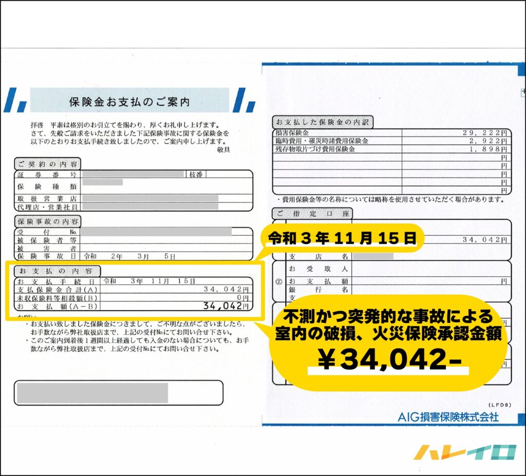 本事例は、不測かつ突発的な事故により、室内の家財に損害が発生した被害について、保険会社より発行された火災保険の保険金支払い証明書です。