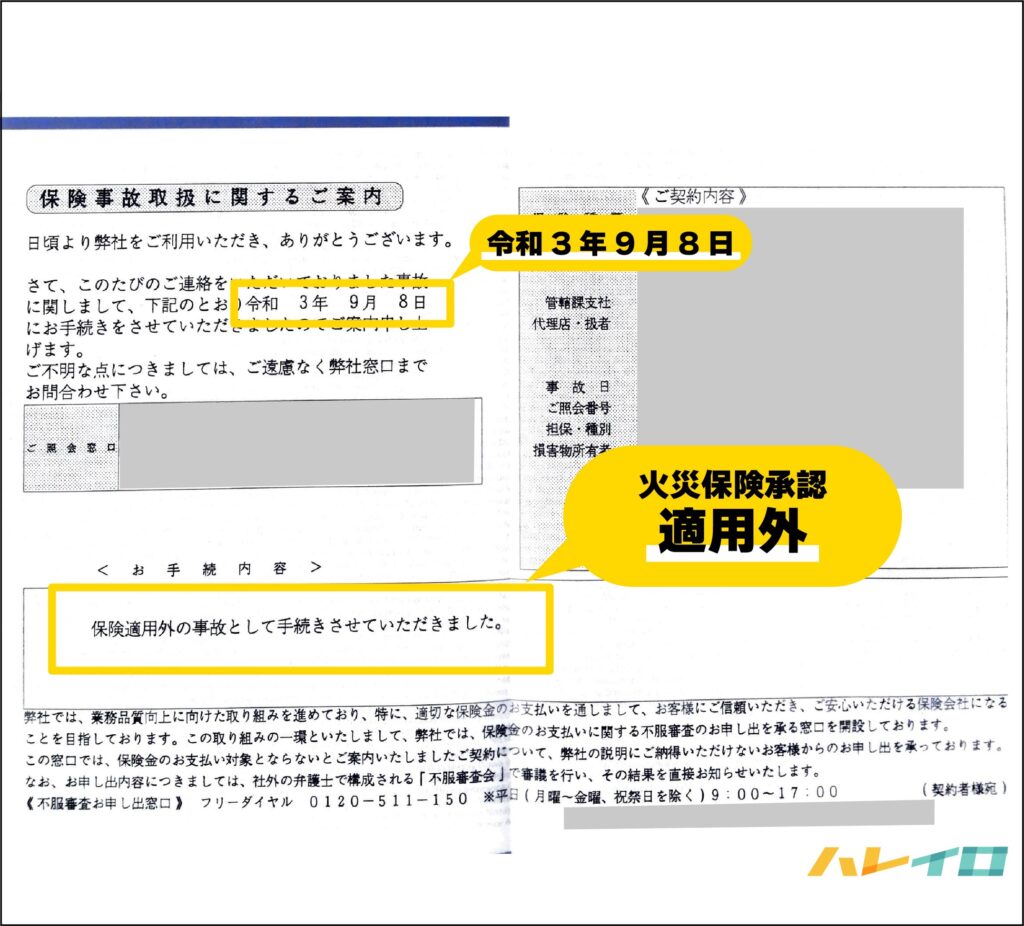 否決の理由としては、損害の状態や発生状況から、経年劣化や通常使用による損耗の可能性が高いと判断されました。