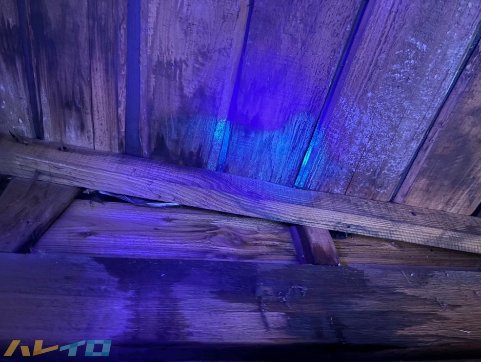 房総半島台風の強風により棟板金が飛散し、その影響で発生した屋内の雨漏りについて、保険金の支払い対象と確認された損害箇所の現場写真です。