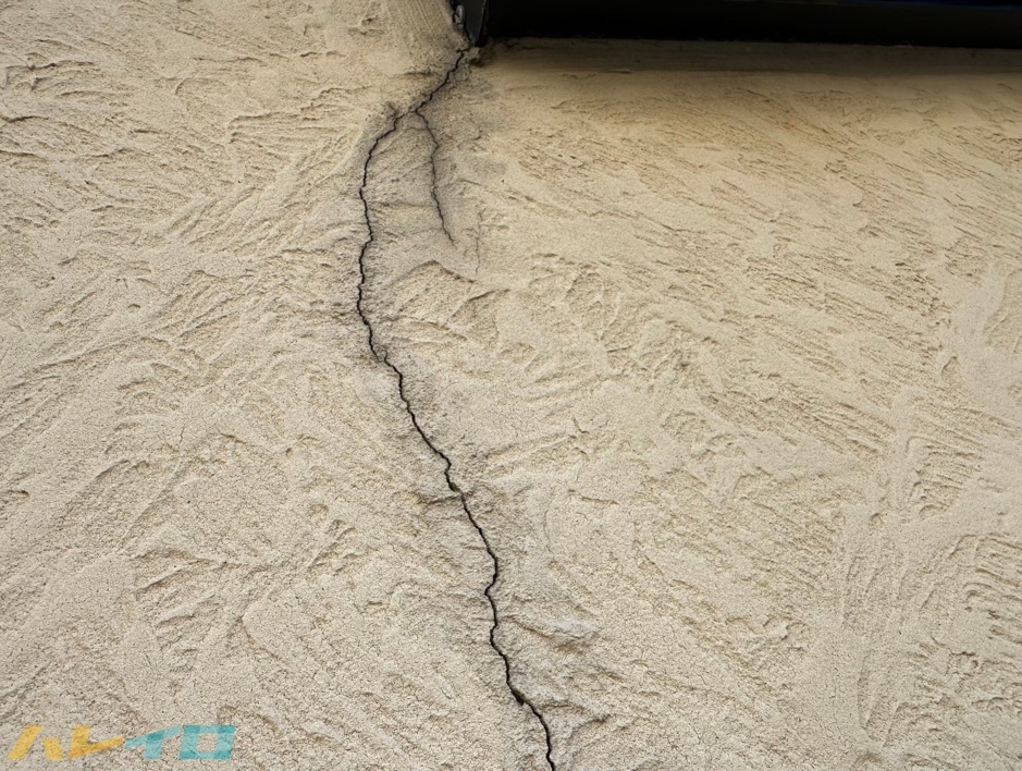地震の揺れによって外壁にひび割れが生じ、地震保険の支払い対象となる損害として確認された箇所の現場写真です。