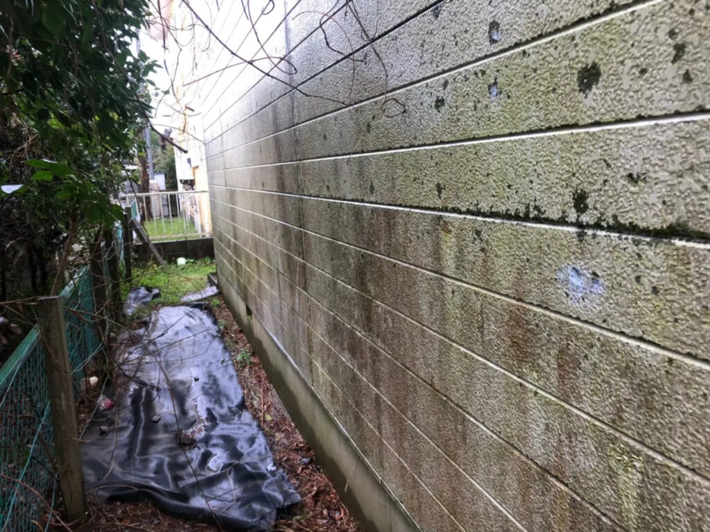 日当たりの悪い北側の外壁に、緑色の苔や黒カビが広範囲に確認されました。これらは塗膜の劣化と湿気の蓄積が原因で、見た目の問題だけでなく外壁材を脆くさせる要因でもあります。