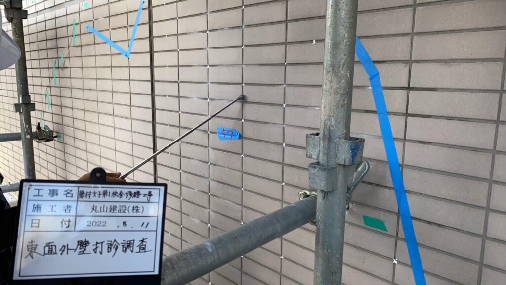 この作業では、外壁のタイルやモルタル部分と、建物の躯体との間に空洞が無いかを打診棒で叩いた時の「音」を聞きながらしっかりと確認をしていきます。