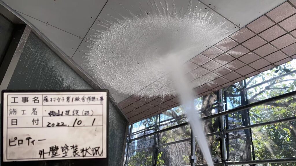 高圧洗浄作業では、外壁だけではなく仮設足場がある時にしか実施できない「天井」や「窓ガラス」などを含めた全ての建物外部の箇所を実施していきます。