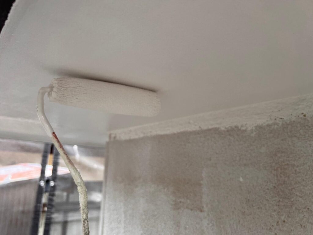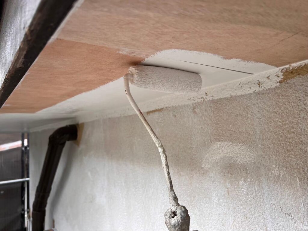 まず、傷んでいた軒天材を部分的に補修し、下地を整えました。この工程を丁寧に行うことで、仕上がりと耐久性が大きく変わります。