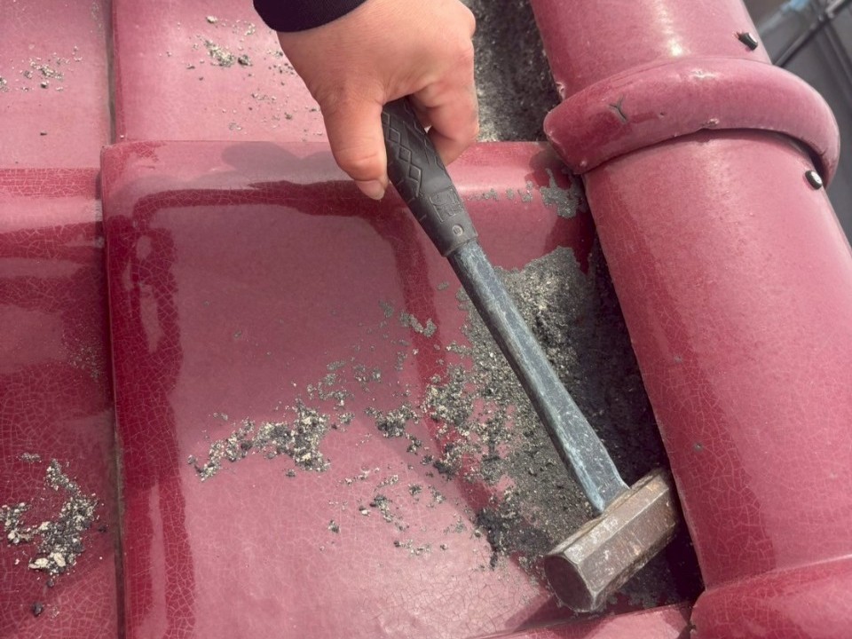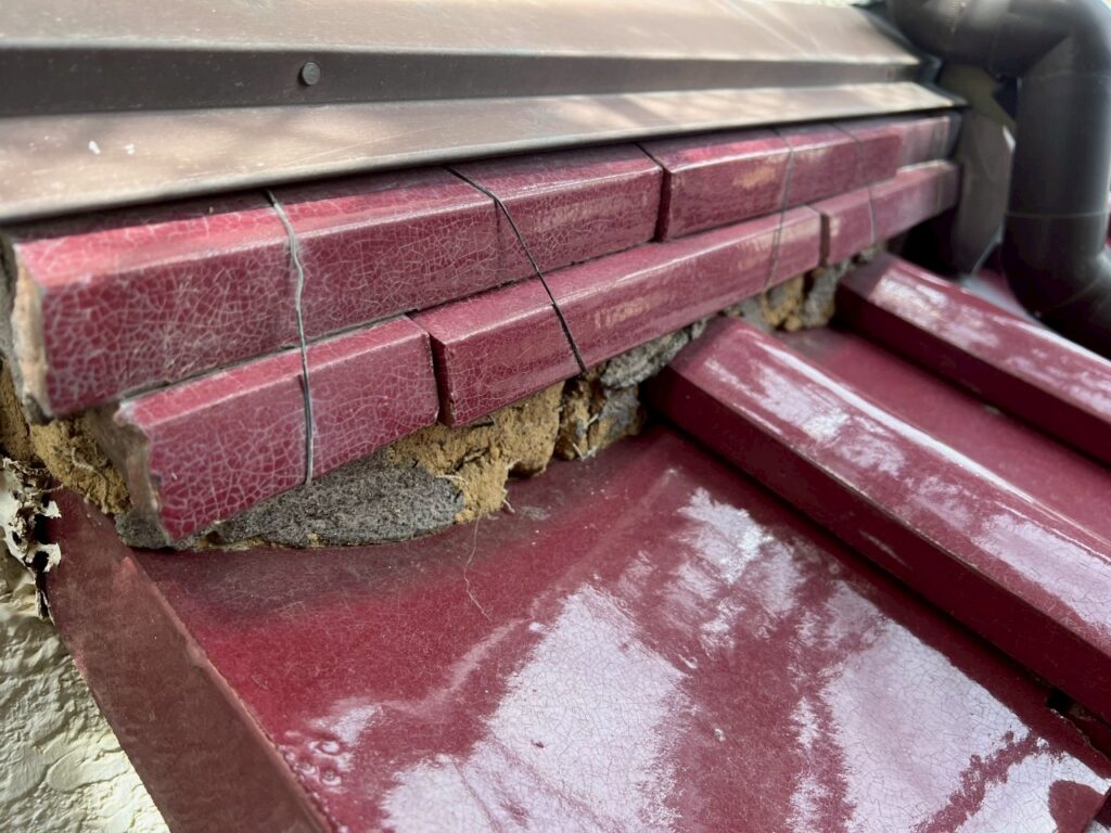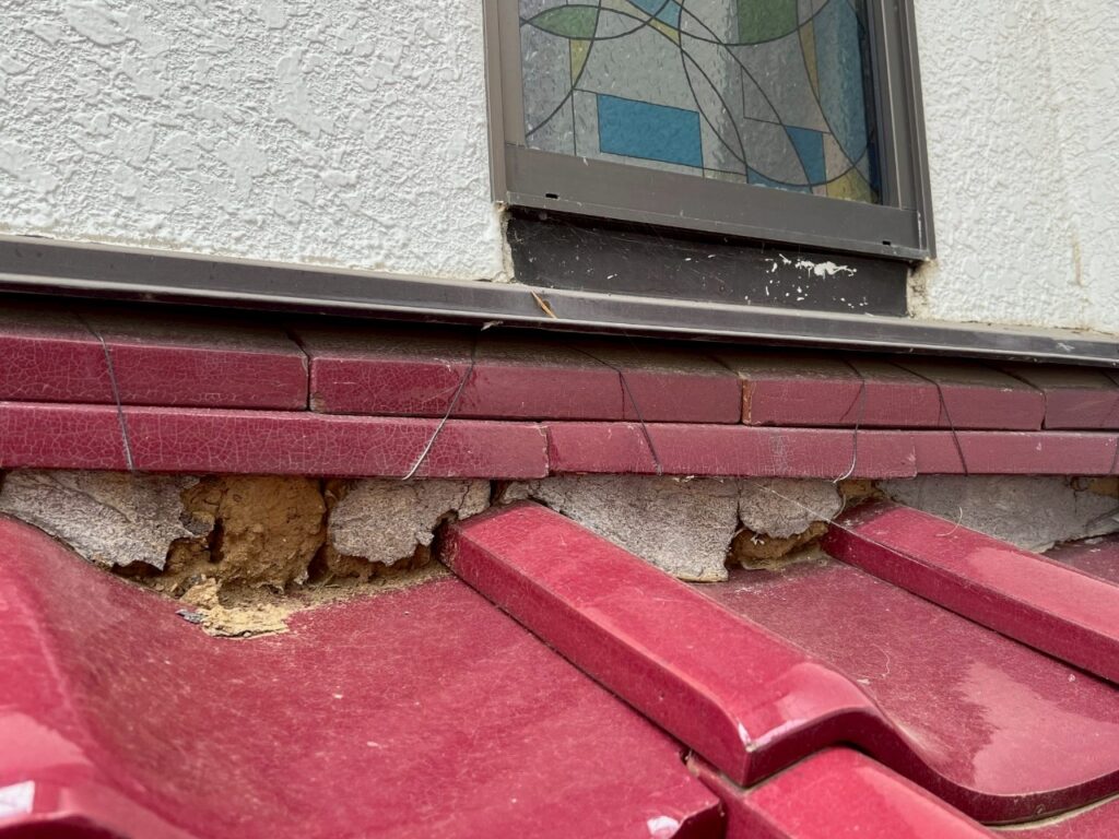 現地を確認すると、瓦屋根の棟部分にある漆喰が劣化しており、ところどころ剥がれ落ちている状態でした。