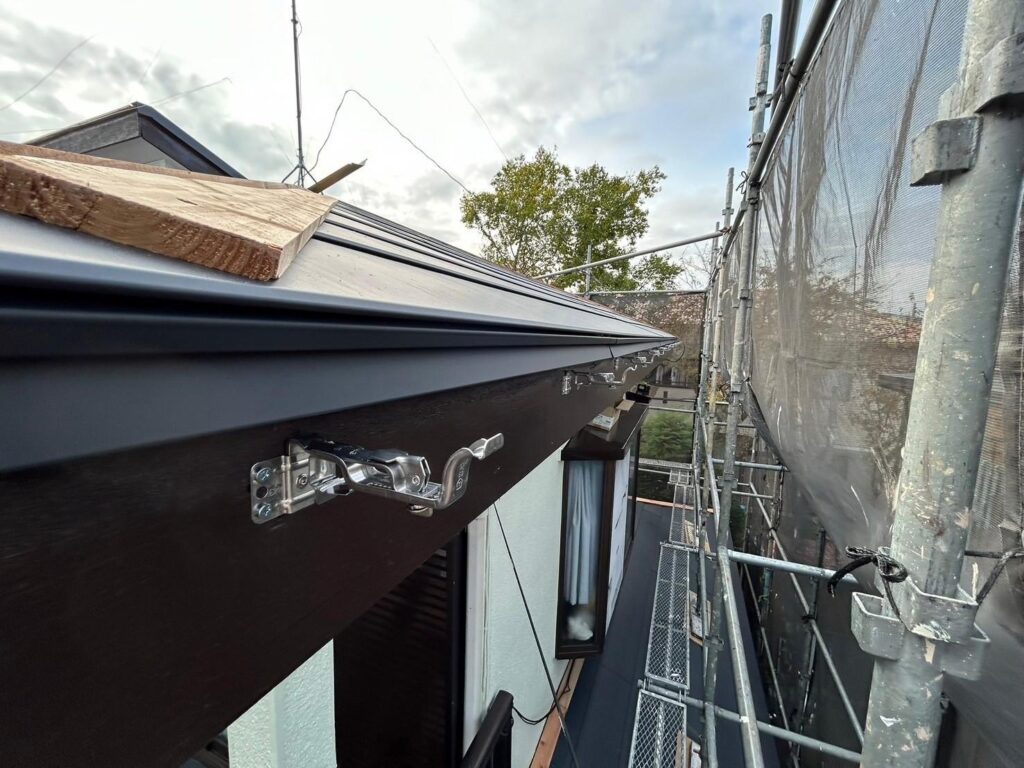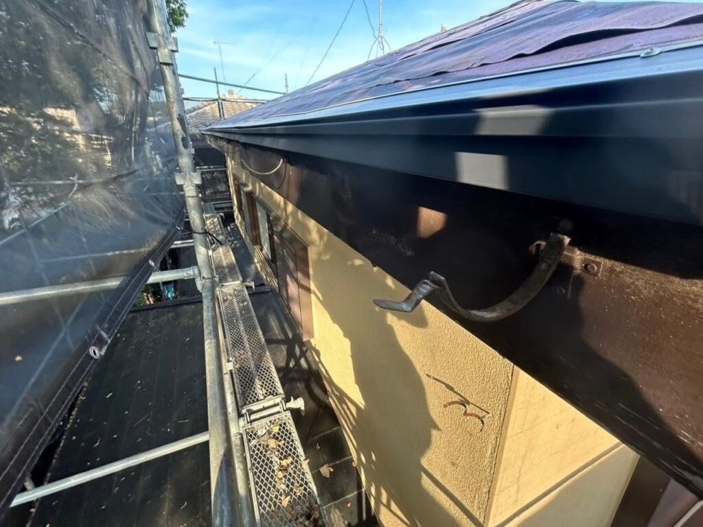 新しい金具を適切な間隔で設置し、雨水がスムーズに流れる角度に調整していきます。
