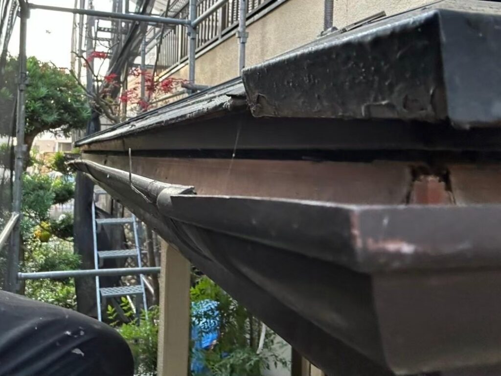 現地で確認すると、雨樋の歪みと支持金具の劣化が進んでおり、雨水がうまく流れない状態でした。さらに落ち葉が溜まりやすい環境だったため、詰まりも発生していました。
