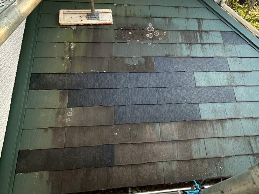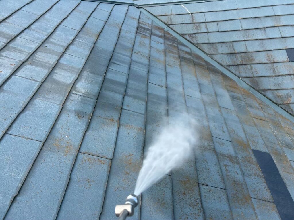 次に、高圧洗浄で屋根の汚れやコケ、古い塗膜をしっかり落とします。この工程はとても重要で、ここが不十分だと塗料がうまく密着しません。