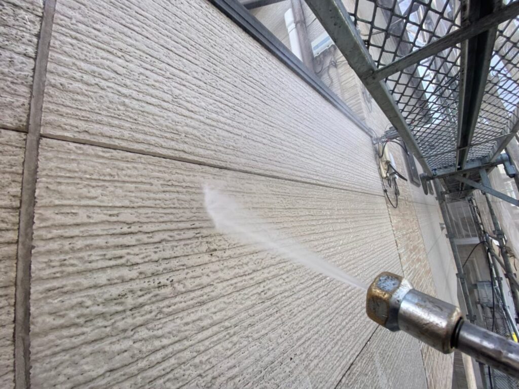 まずは屋根全体を高圧洗浄し、汚れやコケ、古い塗膜をしっかり落とします。この工程を丁寧に行うことで、塗料の密着性が高まります。