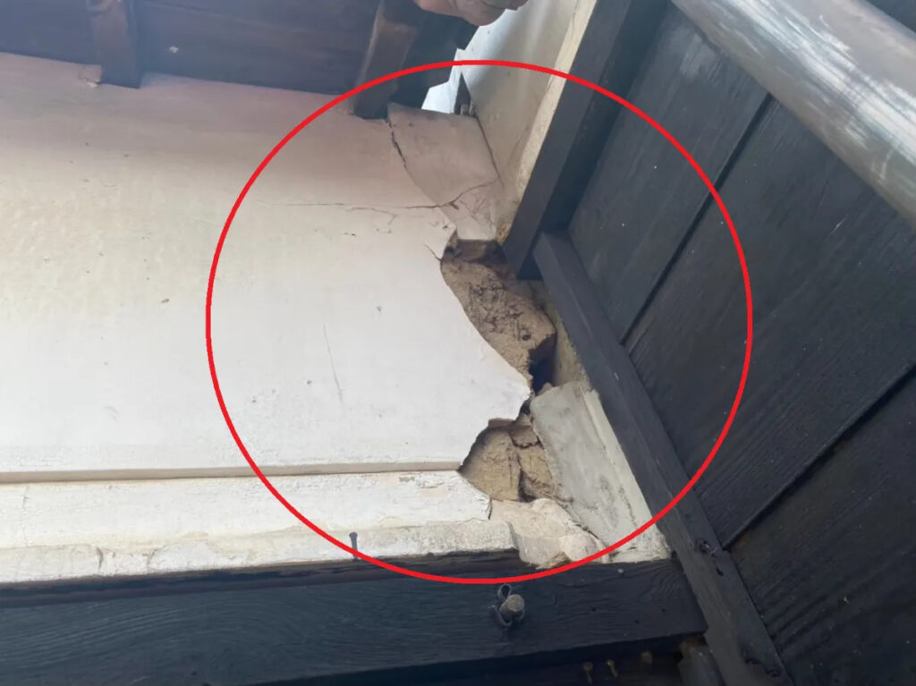 風速25m/sの風が数回あたるだけで、劣化したシーリングが裂け、壁が外側に引っ張られるように剥がれることがあります。